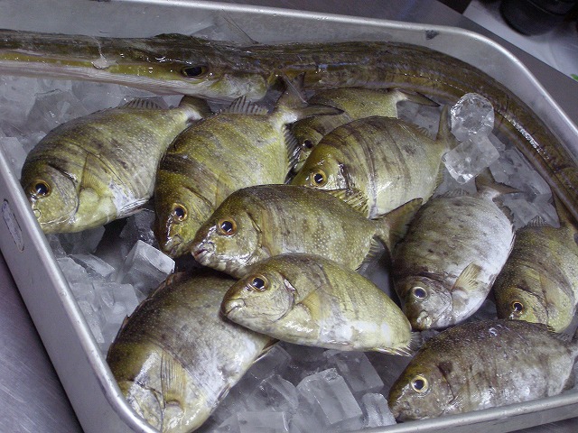 さて、たくさんのアイゴと、一匹狼のヤガラです。 ヤガラは体調は長いのですが、半分は口です。 とってもスリムさんなので、まかない行きです。