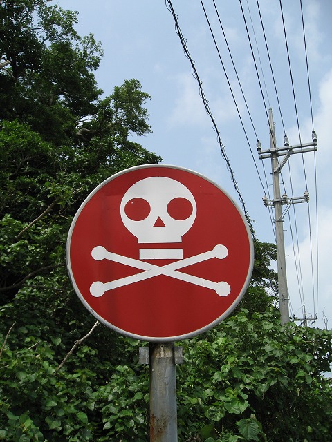2枚目。 『今年の3月まで使われていた船浦港の先に、ドクロが立ってる!』 お客様からの情報で、 ダイビングチームのフロント嬢、「エリ」ちゃんと遊びに出たついでに見に行ってみました。